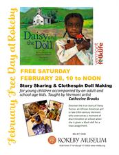 Morning of story sharing and art making at Rokeby Museum led by local artist Catherine Brooks. Discover the true story of Daisy Turner, an African American girl in late 19th century Vermont who overcomes a moment of discrimination at school when she is given a black doll for a class assignment. Make a clothespin doll inspired by Daisy's story that is formed with fabric scraps, yarn and more. Program geared to pre-school children accompanied by their parents and elementary school students.